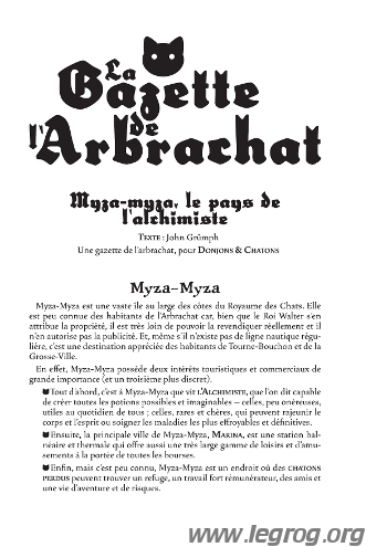 Myza-Myza, le pays de l’alchimiste (17 pages) est un supplément gratuit produit au travers du système de Patreon de son auteur. Ce sixième épisode est un contexte pour Donjons & Chatons. Il s’agit d’une grande île située au large du Royaume des chats et peu connue. Ceci-dit, elle est malgré tour appréciée comme station balnéaire, comme lieu où réside un grand alchimiste et surtout comme refuge pour des chatons perdus.